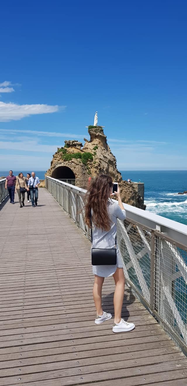 En Biarritz, hay que pagar por aparcar todos los días del año, pero hay bastante sitio en la calle y si no, hay también numerosos parkings. Nosotros aparcamos al lado del Port Vieux, Puerto Viejo y de ahí paseamos por el Chemin de la Vierge. Es un paseo corto y agradable que lleva a una pasarela por donde se accede al Rocher de la Vierge. La Roca de la Virgen es un lugar icónico de la ciudad, y se accede por una pasarela que construyó Gustav Eiffel.