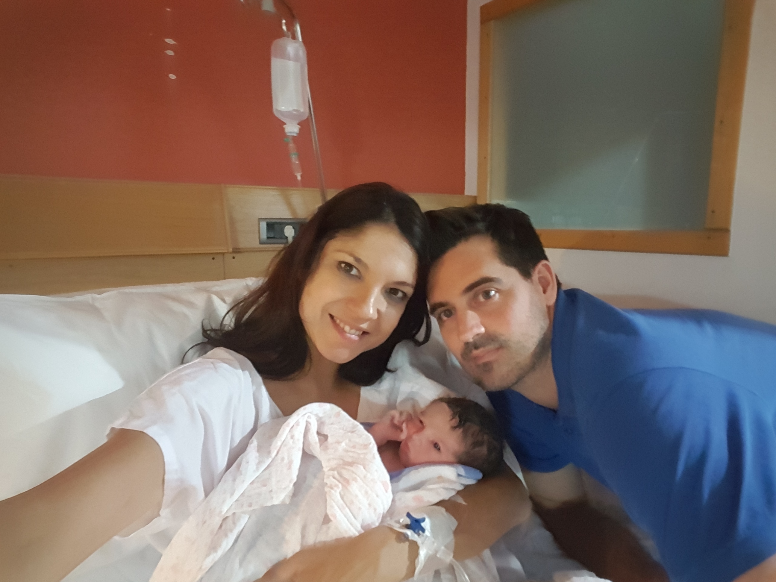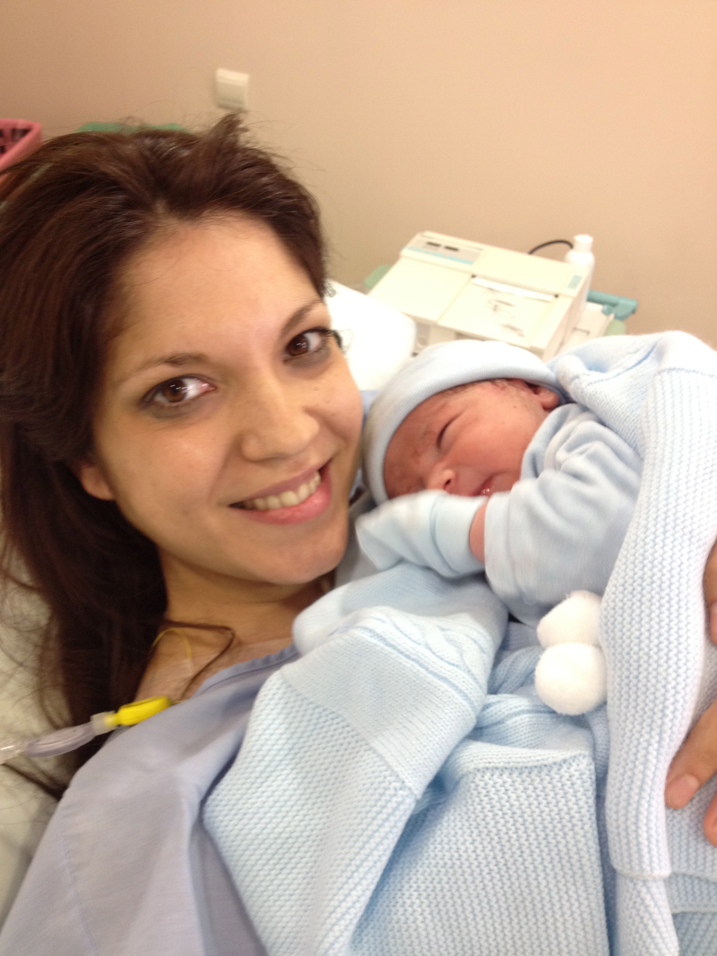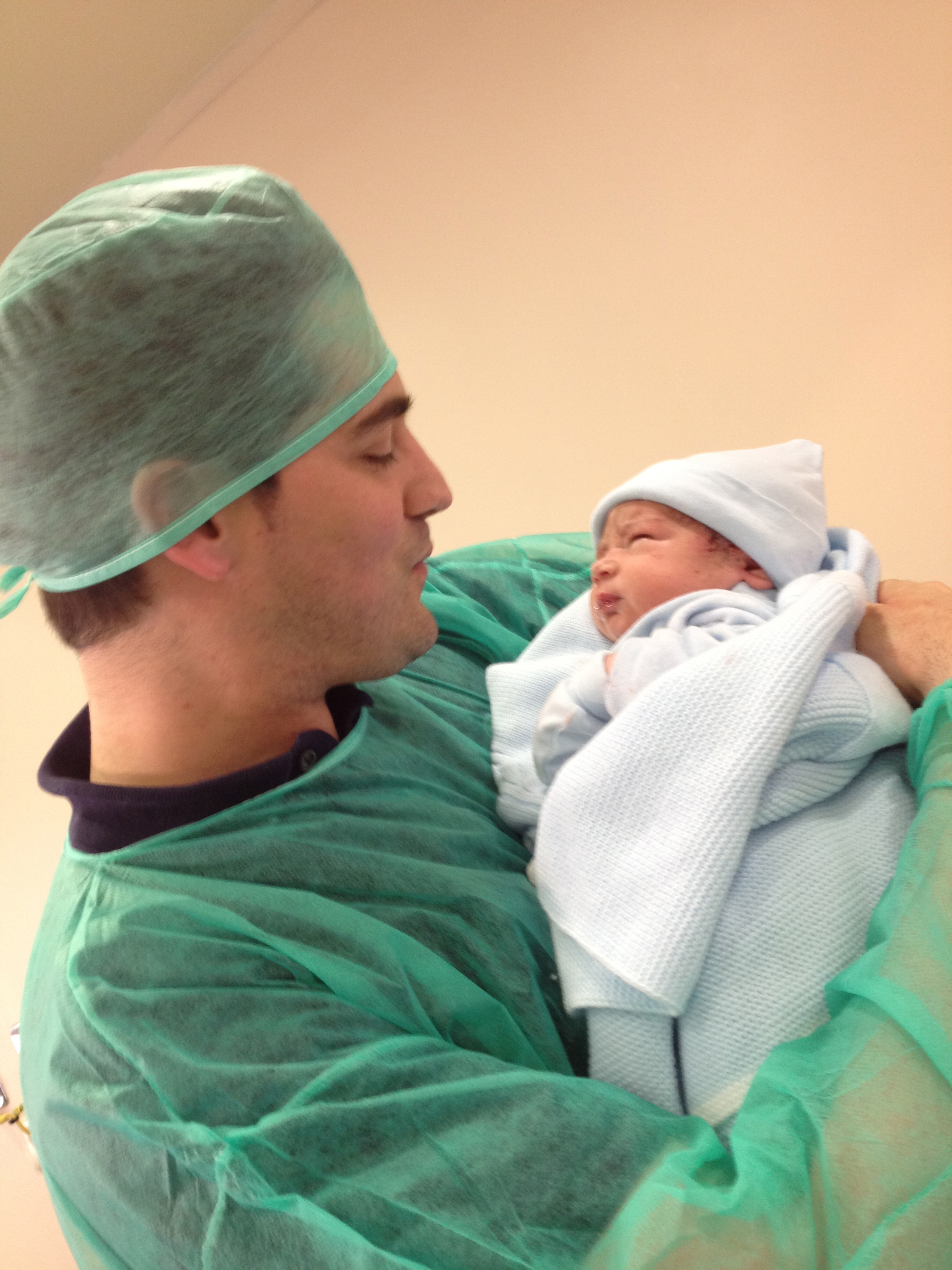 Tardaba en dilatar y el ginecólogo empezó a barajar una cesárea. La matrona, a quien le estaré eternamente agradecida, me dijo «Vamos a intentar algo» y me puso casi casi boca abajo para fomentar que el niño bajase. A las 10 de la mañana me pusieron la epidural… y a las 14.10 de la tarde, 12 horas después de haber ingresado, nació el pequeño Telmo.