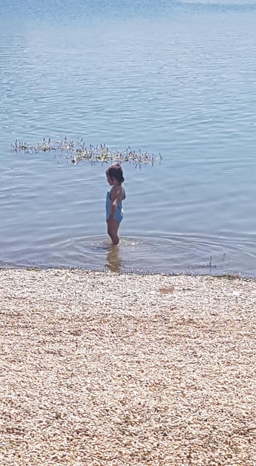 Ya habíamos leído que no había arena, si no piedrecitas. Cubrieron todo el fondo de piedras y gravilla para evitar las algas, por lo que se recomienda llevar escarpines tanto para niños como para adultos. Nosotros llevamos para los niños, porque siempre les ponemos, pero a nosotros se nos olvidaron. Tampoco pasó nada, dejamos las zapatillas en la orilla y entramos al agua descalzos. El primer metro es un poco incómodo pero después ya casi no hay piedras.
